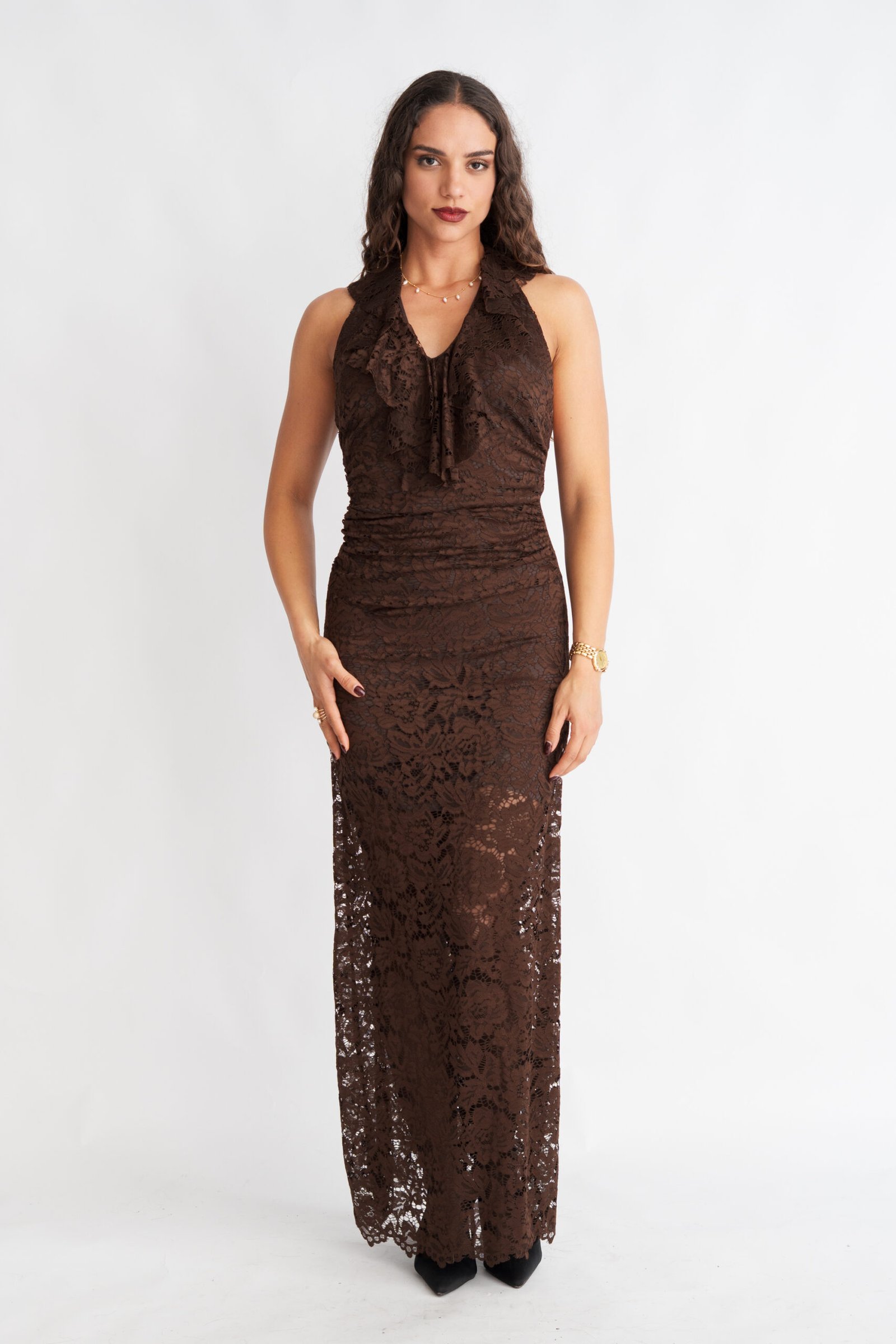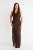 Το Olina Dress είναι ένα κομψό και αέρινο μακρύ φόρεμα σε ζεστή καφέ απόχρωση, ιδανικό για εμφανίσεις που απαιτούν φινέτσα και άνεση. Η γραμμή του αναδεικνύει όμορφα τη σιλουέτα, ενώ το μήκος του δημιουργεί μια elegant και θηλυκή εικόνα.