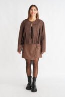 Το Zizel jacket σε μαύρο και καφέ είναι ένα μοντέρνο και εντυπωσιακό κομμάτι που προσθέτει κίνηση και χαρακτήρα σε κάθε εμφάνιση. Τα κρόσια χαρίζουν δυναμική και παιχνιδιάρικη αισθητική, ενώ η εφαρμογή του εξασφαλίζει άνεση και κομψό αποτέλεσμα.